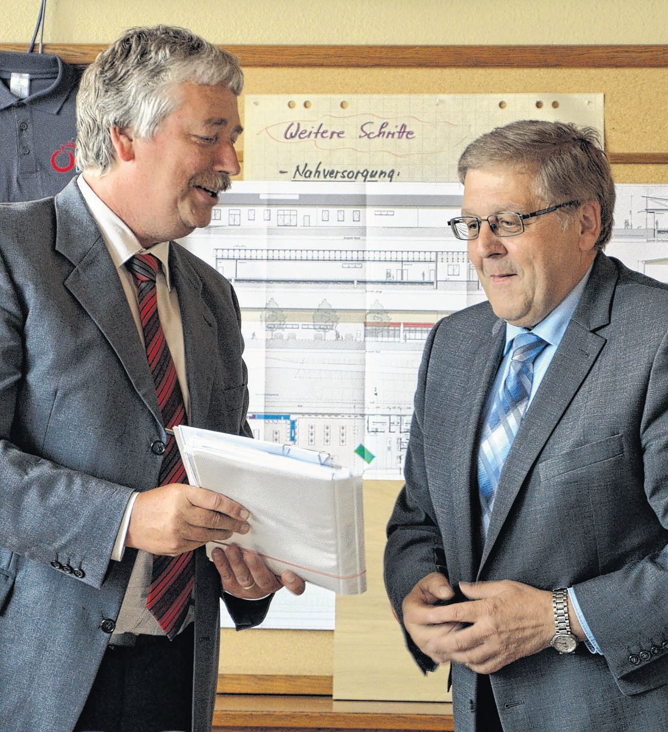 Ein erfreulicher Termin für die Gemeinde Langenfeld fand am gestrigen Freitag im Rathaus statt. Landrat Helmut Weiß überbrachte höchstpersönlich die beiden Baugenehmigungen für das Dienstleistungszentrum sowie die ambulant betreute Wohngemeinschaft.